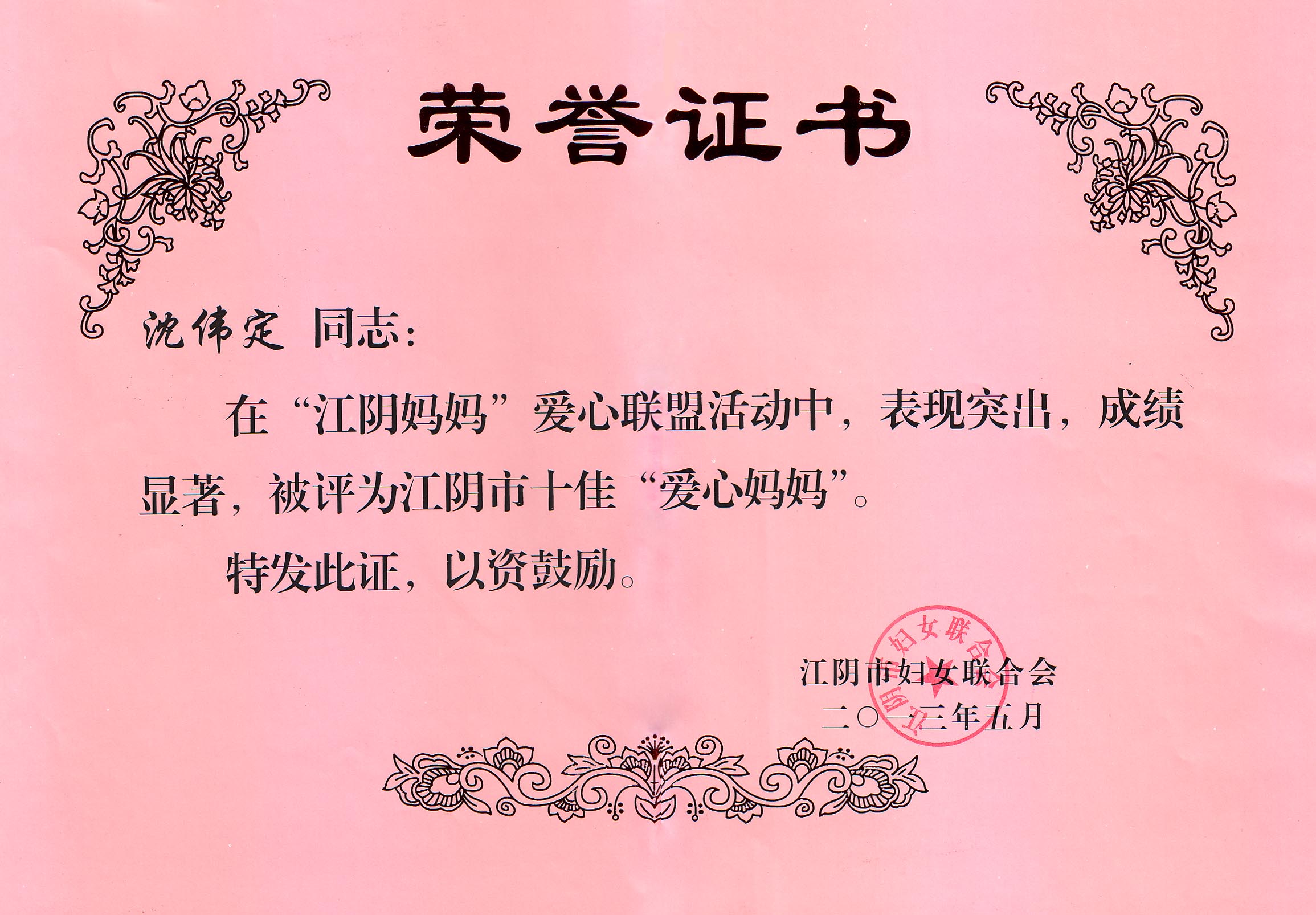 沈伟定理事长在“江阴妈妈”爱心联盟活动中,被江阴市妇联评选为江阴市十佳“爱心妈妈”。